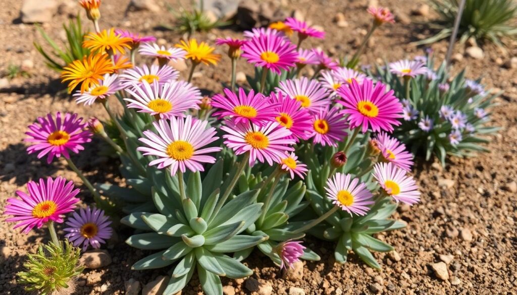 We’ve researched everything you need to know about this resilient beauty that’s perfectly adapted to drought conditions and poor soils. With its dazzling daisy-like flowers that open in bright sunlight and close at night, the midday ice plant creates a spectacular display of colors ranging from vibrant pinks and purples to sunny yellows and whites. Its fleshy, crystalline leaves appear to glisten with thousands of tiny ice crystals—a clever adaptation that helps the plant reflect light and conserve moisture in its native South African habitat.
